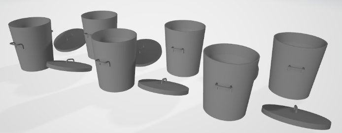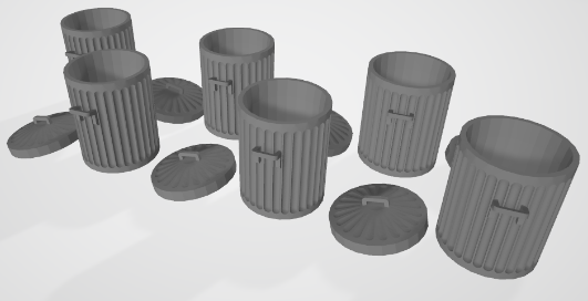A set of galvanized steel ribbed dustbins with separate poseable lids