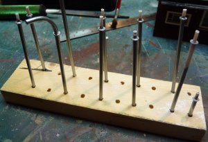 This useful base can be really simply made with any size of wood, and drilled with as many or few holes as you like, in any formation of matrix. Mine has about 20, in two rows of ten in 8in of 2x1 batten. Use to place sticks in while glue sets or paint dry's See TIP 903 for work holders)