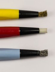 A fibre glass pen is a small long bundle of glass strands, which if the constrained ends are used as a rubbing implement, it acts as very fine abrasive. Perfect for cleaning up metal (like the copper on PCB's) before soldering, or just general cleaning or removal of shininess from flat or uneven surfaces. They come in a propelling pencil like pen, that when to top is swivelled, the glass fibre protrusion is retracted or extended. They do wear out, but the tip is a replaceable item. I must give a warning, that the process does leave a fine residue of glass dust, that you must carefully remove and dispose of off. It not harmful but it is a very bad skin irritant!