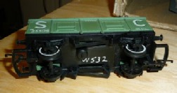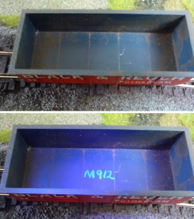 Tip 909 is great when you can turn over a wagon to see its number, but how do you see what number an Engine or Wagon is when its on the track, without lifting it off? You can number them with a Ultra Violet (UV) marker pen, as used on bank notes. It is essentially a permanent marker pen, with (invisible) transparent ink, however, under ultra Violet light, it fluoresces and can be seen easily. Cheap UV lights can be had that will illuminate your marked wagon numbers, only when shone on the wagon and cannot be seen in normal lighting conditions. {I mark my 4 digit DCC code on my engines this way}Unwanted markings can be removed with surgical spirit, meths etc You can even buy UV pens with a UV light on the end!(You can also make secret treasure maps!)