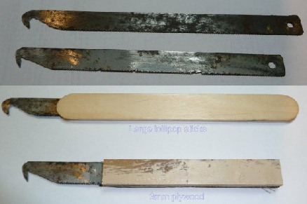 Any hacksaw blade will do, old or new. Grind a vee into the end as illustrated, tapering away toward the handle and near to right angles toward the tip (the exact angle is not important)