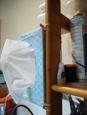 We all need a tissue or kitchen towel frequently when at the work bench. Make life easier (and one handed) by securing a tissue box (or kitchen towel) so that it can be without reaching and using two hands.
